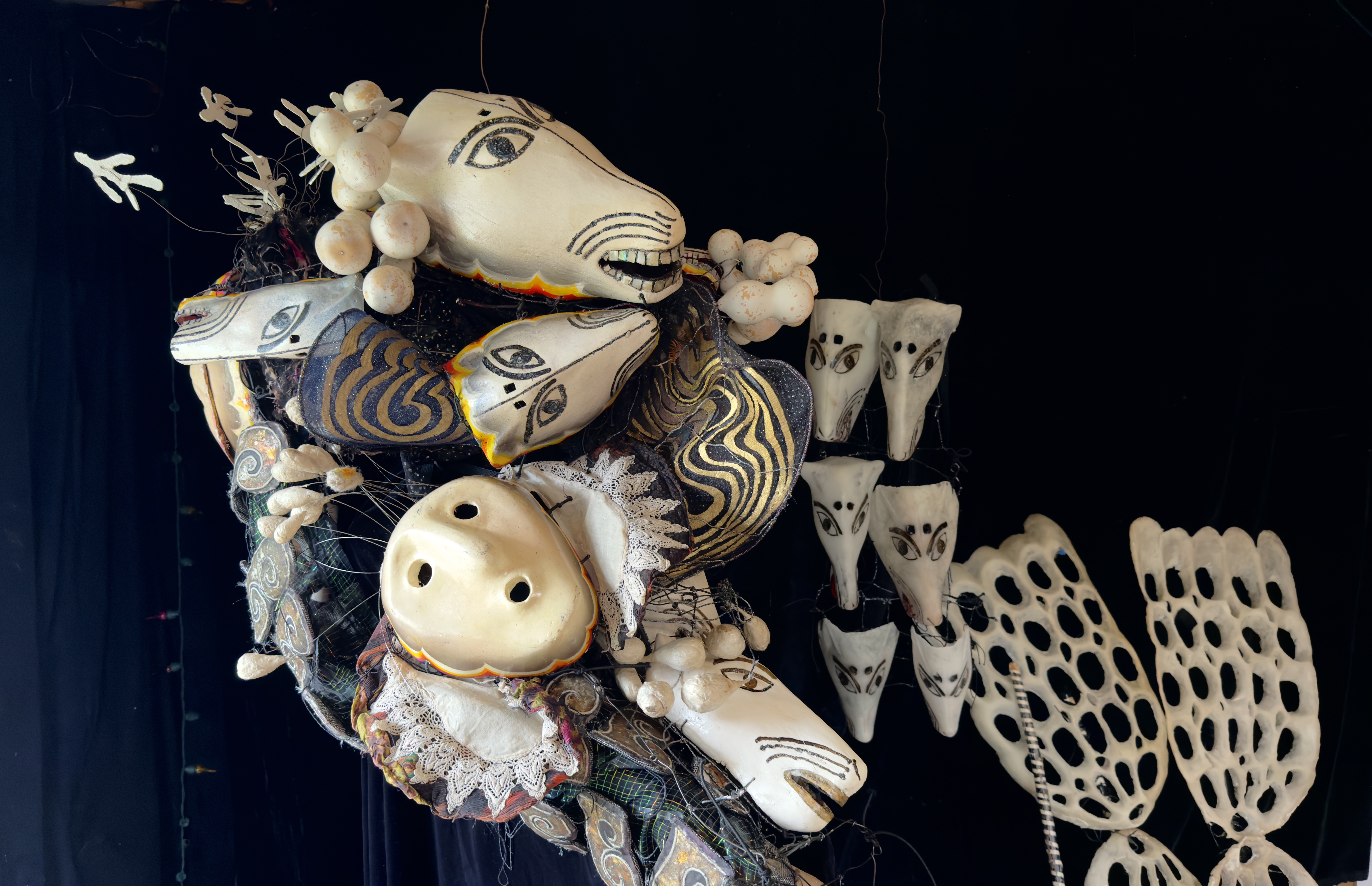 Sha Sha’s installation costume represents a giant god looking down onto the world as it moves through various disasters of wind or weather and shadows. The pulsating fox heads are woven and beat throughout the giant costume and the stage.